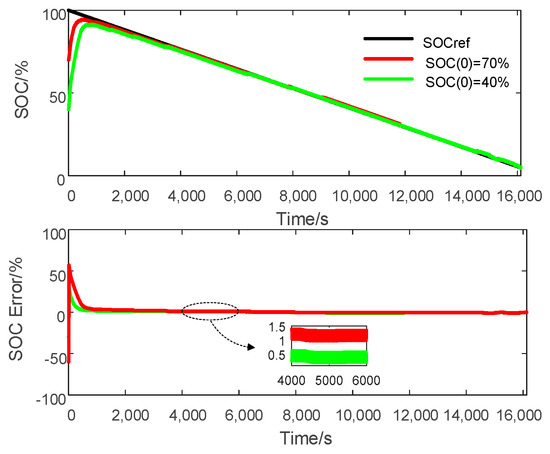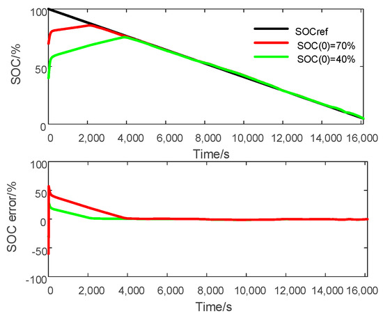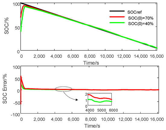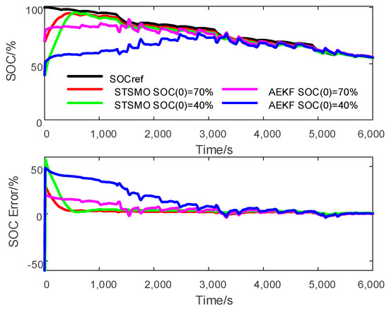 A fast convergence speed helps to improve the capability to track the SOC reference at any initial SOC (e.g., 70% and 40%). Figure 17 presents the SOC convergence process of the STSMO and AEKF at different initial SOCs for the DST discharge profile. Table 3 gives the corresponding convergence time, which is the time that the SOC error is reduced to 5%. According to Figure 17 and Table 4, it is clear that the convergence speed of the STSMO-based SOC estimation is faster than that of the AEKF-based SOC estimation, and the SOC convergence time of the AEKF is more than 3 times that of the STSMO. Therefore, compared with the AEKF, the STSMO has faster convergence speed at certain initial SOC deviations.