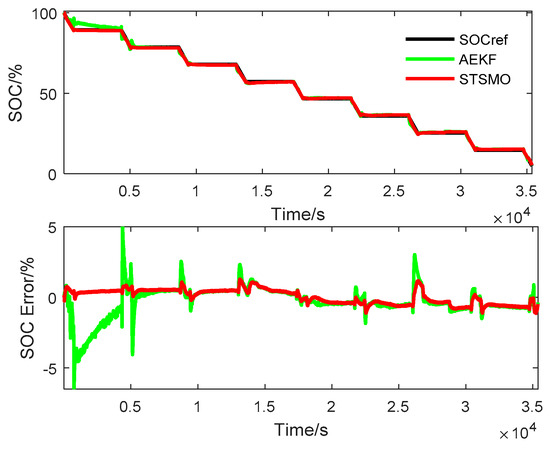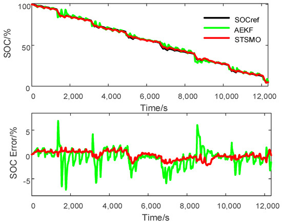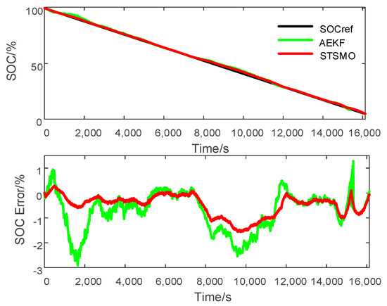 Figure 14, Figure 15 and Figure 16 show the comparison of SOC estimation results between the AEKF and STSMO under three different discharge profiles. It can be found that both methods can track the SOC reference accurately. However, according to the error in Figure 14, Figure 15 and Figure 16, the SOC estimation errors of the STSMO are closer to zeros while the errors of the AEKF are just bounded in by about ±5%. To quantificationally illustrate the improved accuracy of the STSMO-based SOC estimation, Table 2 lists the RMSE of the SOC estimation at different discharge profiles. It can be seen that the RMSE of the STSMO is always smaller than that of AEKF for the three different discharge profiles.