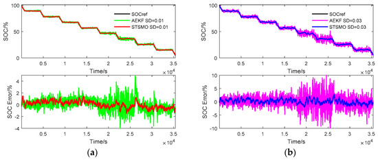 In an on-line system, it is difficult to obtain accurate voltage/current values due to sensor precision and electromagnetic interference. To evaluate the robustness of the STSMO, random normally distributed noise was added to the measurement signals, i.e., voltage and current. The mean value of the noise was zero and the standard deviations (SD) SD = 0.01 and SD = 0.03 were studied. The SOC estimation results based on the STSMO and AEKF with two kinds of different noises are shown in Figure 18, and the error range is summarized in Table 5.