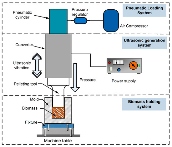 The ultrasonic generation system consisted of three major parts: a power supply (which converts 60 Hz electrical power into 20 kHz electrical power), a converter (which converts high-frequency electrical energy into mechanical motion), and a titanium pelleting tool (which is connected to the converter and used to compress biomass).