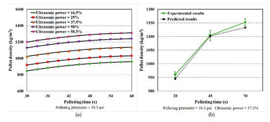 To calculate the pellet density, the values of the input variables in Table 1 need to be incorporated into Equation (6). The predicted values of pellet density under various conditions are demonstrated in Figure 2, Figure 3 and Figure 4. As shown in Figure 2a, the pellet density increased as the pelleting time increased from 30 s to 60 s for different levels of ultrasonic power. The pellet density increased gradually and then became stabilized over the pelleting time. Figure 2b shows a comparison between the predicted pellet density and the experimental results at different levels of pelleting time while the pelleting pressure was kept at 34.5 psi (237,869.1 Pa) and ultrasonic power was kept at 37.5%. The kinetics of the pellet density calibrated from Equation (6) agree well with experimental results. From both the model and experimental data, the pellet density increased by 16.5% as the pelleting time increased from 20 s to 45 s, and the pellet density increased by a further 2.8% as the pelleting time proceeded from 45 s to 70 s, respectively. The magnitude of the increase in the pellet density declined since the pellet was observed to fail to be significantly condensed at a late stage of pelleting (from 45 s to 70 s).