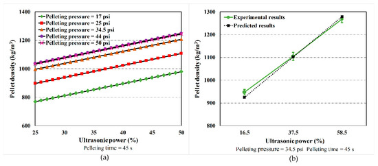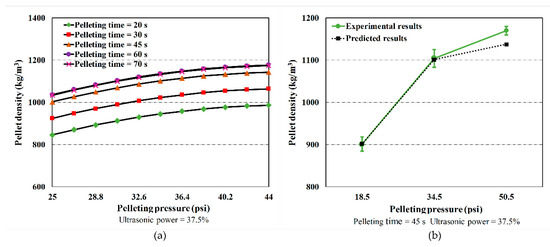 The effects of pelleting pressure on the pellet density in UV-A pelleting can also be calculated using Equation (6). As demonstrated in Figure 4a, an increase in the pellet density was observed when the pelleting pressure increased from 25 psi (172,369 Pa) to 44 psi (303,369 Pa) for different levels of pelleting time. However, the increase in pellet density induced by pellet pressure is not linear. This indicates that the pellet density may not be further increased after a certain level of pelleting pressure (for example, 44 psi). The reason for this is due to the fact that the pellet in the mold cannot be further condensed when the pellet pressure exceeded a certain level (for example, 44 psi). Figure 4b shows the predicted results of the pellet density that matched well with experimental results at different levels of pelleting pressure while the ultrasonic power was kept at 37.5%, and the pelleting time was kept at 45 s. It can be seen that the pellet density increased when the pelleting pressure increased. Although the experimental result is slightly higher than the simulation result as pelleting pressure increased from 34.5 psi (237,869.1 Pa) to 50.5 psi (348,185.2 Pa), the trend of the relationship between pellet density and pelleting pressure still agrees well with that trend determined by our experimental data. Furthermore, previous studies [18,20,22,23] indicated that the pellet density increased dramatically as the pelleting pressure increased from 20 to 50 psi (137,895 to 344,738 Pa). To further validate our results, the relationship between the pelleting pressure and pellet density using other pelleting methods and biomass materials was summarized in Table 4. As demonstrated in Table 4, the pelleting pressure had positive effects on pellet density (an increase in the pelleting pressure and pellet density was denoted by an upward arrow).