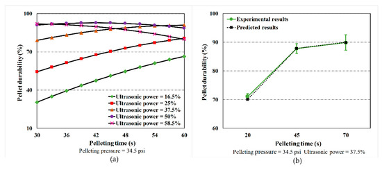 The effects of pelleting time on pellet durability. (a) The predicted pellet durability in relation to the pelleting time at different levels of ultrasonic power (ranging from 16.5% to 58.5%) when the pelleting pressure was set to 34.5 psi (237,869.1 Pa) and the pelleting time increased from 30 s to 60 s. (b) For pellet durability, the comparison between the model results and experimental results at various levels of pelleting time (mean value ± SD).