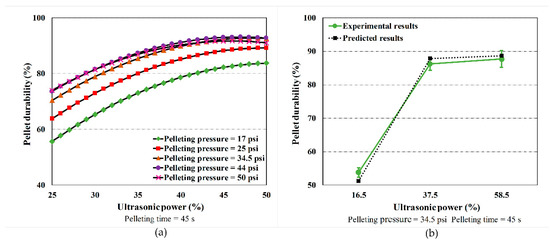 The effects of ultrasonic power on pellet durability. (a) The predicted pellet durability in relation to ultrasonic power at different levels of pelleting pressure (ranging from 17 psi to 50 psi) when the pelleting time was set to 45 s and the ultrasonic power increased from 25% to 50%. (b) For pellet durability, the comparison between the model results and experimental results at various levels of ultrasonic power (mean value ± SD).
