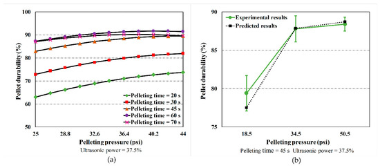 To calculate the pellet durability, the values of the input variables in Table 1 need to be incorporated into Equation (7). The effects of pelleting time on pellet durability were predicted by Equation (7) and the results were depicted in Figure 5a. It was observed that there was an increase in pellet durability as the pelleting time increased at lower ultrasonic power (16.5%, 25%, and 37.5%). The pellet durability slightly increased and then decreased at a higher ultrasonic power (50%). When the ultrasonic power was fixed to 58.5%, the pellet durability decreased as the pelleting time increased. The decrease in pellet durability may be due to charring. Charring during the pelleting process can significantly reduce the quality of pellets [39]. High ultrasonic power with long pelleting time resulted in high temperature and could eventually lead to charring [17]. The predicted pellet durability was compared with the experimental results at different levels of pelleting time while the pelleting pressure was kept at 34.5 psi (237,869.1 Pa) and ultrasonic power was kept at 37.5%, as shown in Figure 5b. The kinetics of predicted pellet durability matched well with the trend determined by experiments. Both the model and experimental data showed that the pellet durability increased by 23.5% as the pelleting time increased from 20 s to 45 s, and the pellet durability increased by a further 2.4% as the pelleting time proceeded from 45 s to 70 s, respectively. The same trend was reported by Nottingham et al. [19] who found that an increase in pelleting time from 30 s to 50 s induced an increase in pellet durability.