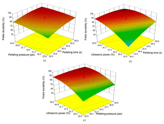 In this section, the interaction effects including the interaction effect between pelleting time and pelleting pressure, the interaction effect between pelleting time and ultrasonic power, and the interaction effect between pelleting pressure and ultrasonic power on pellet durability were investigated. As shown in Figure 8a, the pellet durability increased from 86.8% to 91.4% (increased by 5.3%) at a higher pelleting time level (60 s), and increased from 72.8% to 80.7% (increased by 10.9%) at a lower pelleting time level (30 s) due to the interaction effects between pelleting time and pelleting pressure, when pelleting pressure increased from 25 to 44 psi (172,369 to 303,369 Pa). It can be concluded that the effects of pelleting pressure on pellet durability were more significant at the lower level of pelleting time.