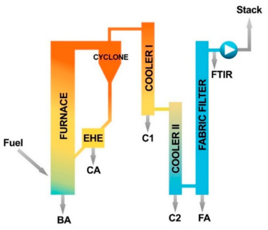 The solid particles were separated from flue gas in a cyclone (cut-point 10 μm) and returned to the bottom bed through a return leg and an external heat exchanger (EHE) where solids were cooled in order to control the temperature of the bed. After the cyclone, the flue gas was cooled with a two-stage cooling system, consisting of two shell-and-tube heat exchangers in series. The heat transfer surfaces of these heat exchangers were composed of longitudinally-streamlined tubes. The fly ash was removed from flue gas with a fabric filter. The cleaned flue gas was led out of the system by means of an induced high pressure fan through the stack.
