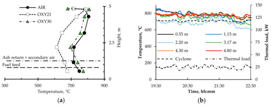 (a) Temperature distribution along the circulating fluidized bed (CFB) combustor riser and in the cyclone; (b) temperatures in the CFB cyclone exit and furnace at different heights. The temperatures deviance, due to fuel feeder, was up to 5%.