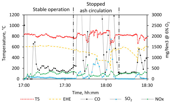 To compare the influence of circulating solid matter, circulation was stopped (the airflow to EHE was stopped). The temperatures in the riser were unstable (see Figure 3). The combustion efficiency decreased (the CO level increased over the measuring range) and SO2 concentration in flue gas increased notably (from 50 to 1500 mg/Nm3). The ash concentration in the furnace decreased and there was not enough material to bind all the sulfur. This implies that despite the high calcium concentration in the fuel, working in a bubbling bed mode, did not ensure sufficient sulfur binding. The CFB combustion mode ensured sufficient conditions for sulfur binding, even in oxy-fuel mode.