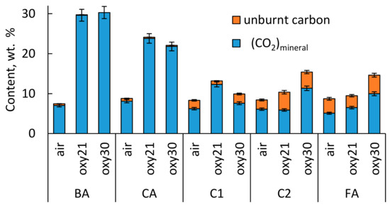 Mineral CO2 content of the oxy-fuel ashes was considerably higher than in the ashes obtained in air mode (Figure 4). The difference was especially large for BA and CA. The composition and share of ash flows is different in every boiler. For oil shale CFB combustion, the share of bottom and filter ash is the largest. The BA obtained contained the most calcium and thus the effect on total CO2 emission was considerable. Of the total carbon in the fuel, 20% was inorganic (see Table 1). It is theoretically possible to reduce the extent of decomposition of carbonate minerals to 28% in an oxy-CFB combustor firing Estonian oil shale [20]. The minimum is defined by the dolomite and sulfur content in the fuel. Limited decomposition of the carbonate minerals decreases CO2 emissions from oil shale combustion, but increases ash production.