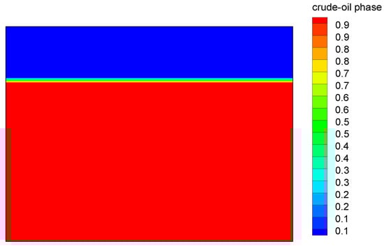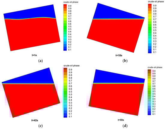 Figure 6 and Figure 7 show the gas liquid phase distribution at different time instants for Case 1 (static) and Case 2 (oscillation), respectively. In Case 1, the interface of gas–liquid phase does not change with time, and the phase distribution at different time is shown in Figure 6. Different from Case 1, the interface of the gas–liquid phase in oscillating case changes with time. Figure 7 shows the four typical time instants in Case 2 (). As shown in the figure, there is a small amount of wave on the surface at the beginning of the oscillation, and the liquid level tends to the horizontal surface as time goes by. This is because the oscillation frequency is small and the liquid surface has enough time to return to the horizontal plane.