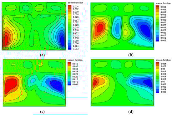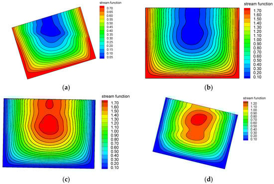 Figure 9 presents four typical instantaneous stream functions in Case 3, in which Figure 9a,b shows two states at which the domain is rotating to the left, and Figure 9c,d, shows two states at which the domain is rotating to the right. Different from Case 1, the flow field in Case 3 is dominated by integral flow generated by rotation. Because of the effect of rotation, the distribution of stream function is asymmetric, running towards the direction of rotation, and the direction of the flow is also alternately changing. In Figure 9, under the oscillating effect, the streamlines near the solid boundary are running consistent with the solid boundary trend, while there is a central vortex in the core area of the fluid.