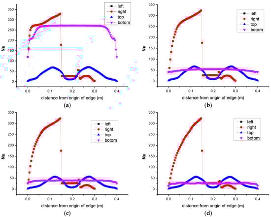 Instantaneous boundary Nusselt number in Case 3: (a) t = 264 s (moving to the left); (b) t = 660 s (moving to the left); (c) t = 990 s (moving to the right); and (d) t = 2112 s (moving to the right).