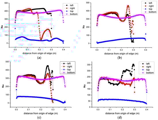 Instantaneous boundary Nusselt number in Case 1: (a) t = 60 s; (b) t = 660 s; (c) t = 1020 s; and (d) t = 2106 s.