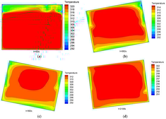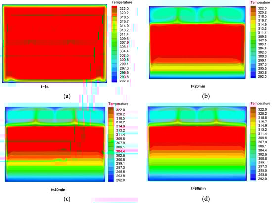 Instantaneous temperature fields in Case 1 (non-osculating condition): (a) t = 1 s; (b) t = 20 min; (c) t = 40 min; and (d) t = 60 min.