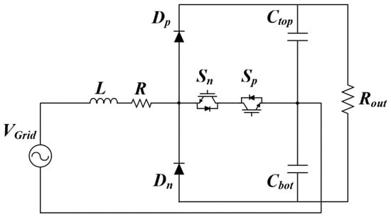 The Vienna rectifier discussed in this paper is similar in structure to a T-type inverter. However, in this device the outer switches are substituted for diodes, Dp and Dn, as shown in Figure 1, which restrict the flow of energy from DC to AC. Furthermore, we consider a single-phase topology, for application to the on board charger (OBC) of an EV, because of the simplified structure of this configuration, and its use of fewer switching devices [,,,].