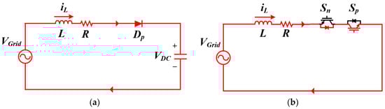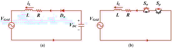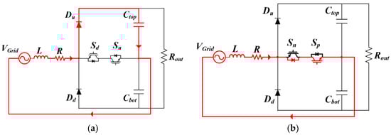 The current paths, when the top switch is off or on, are shown in Figure 6a,b, respectively. When the input voltage, VGrid, is positive, the current flows through the switches if Sp is on, and through Dp if Sp is off. The voltage equation when the switch is on can be expressed as: