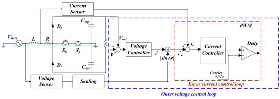 A block diagram of a complete Vienna rectifier system, including control circuitry, is shown in Figure 4. The voltage controller comprising the outer control loop consists of a PI controller, the input to which is the error between the sensed DC link voltage and the reference DC link voltage. The voltage controller of the conventional and proposed method applied system is same, both are PI controller. The output of the voltage controller is the reference current. In this image, sinωt is the waveform of the grid voltage, which is obtained by dividing the sensed grid voltage by its magnitude. The final line current reference, iL*, is obtained by multiplying i* with sinωt. The input to the inner current control loop is the error between the sensed line current, iL, and iL*. A PI controller is adopted for the current controller, the output of which is the PWM duty cycle. The bandwidth, ωcc, of the current control loop should be wider than that of the voltage control loop. In addition, to prevent noise and disturbance, this ωcc should be 1/20 or 1/10 of the switching frequency. Hence, the ωcc of the system is limited by the switching frequency.