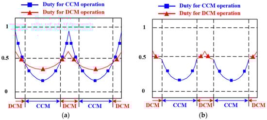 The average current in both the heavy load and light load conditions are controllable using the duty cycles optimized for CCM and DCM operation, respectively. However, in the medium load condition where both conduction modes coexist, the appropriate control method should be determined for the relevant mode of operation. During DCM operation, the duty cycle calculated using the CCM equation is always larger than the duty cycle calculated using the DCM equation. In contrast, during CCM operation, the duty cycle calculated using the DCM equation is always larger than the duty cycle calculated using the CCM equation. Therefore, by verifying the smaller duty cycle in the present state of operation, it is possible to select the appropriate duty cycle for each mode. Figure 9 shows the operation of the mode detection method. The regions where the duty cycles for CCM and DCM intersect are shown in Figure 9a. At these intersection points, the conduction mode of the rectifier changes. By applying the criterion defined in the mode detection method, it is possible to select the optimal duty cycle for the relevant conduction mode, as illustrated in Figure 9b.