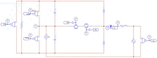 To verify the operation of the proposed algorithm, we performed a simulation using PSIM software. Figure 12 shows a schematic of the 1-kW-rated single-phase Vienna rectifier used in simulation. Moreover, both the top and bottom DC voltage are sensed, for calculating the optimal duty cycle of the model-based predictive controller (MPC). The input voltage of the system is 110 Vrms, varied at 60 Hz. The DC link voltage is controlled to 350–400 V. The controller should conduct one control operation per one control period because the proposed method should predict the next state current based on system model. Hence the sampling time is selected as 100 µs. Detailed simulation parameters are given in Table 1.
