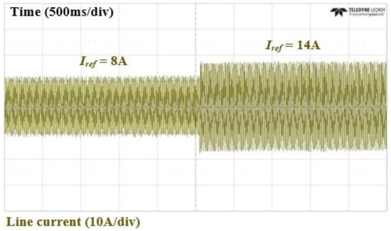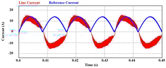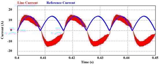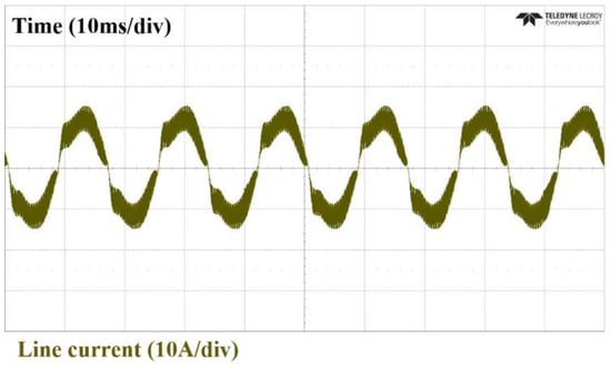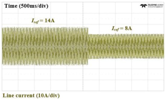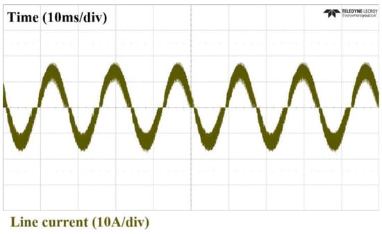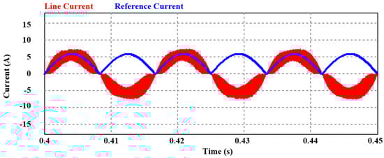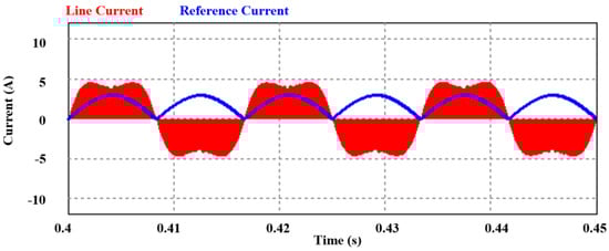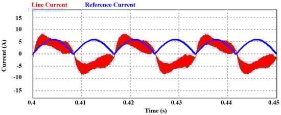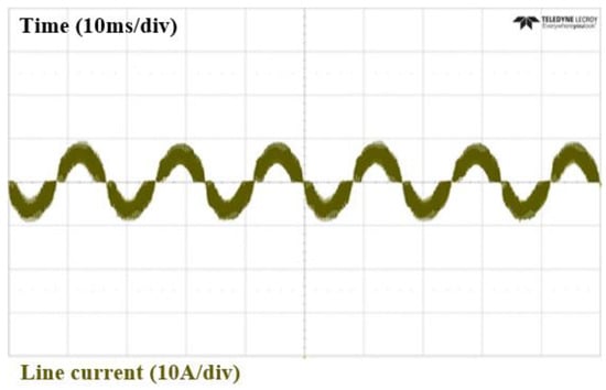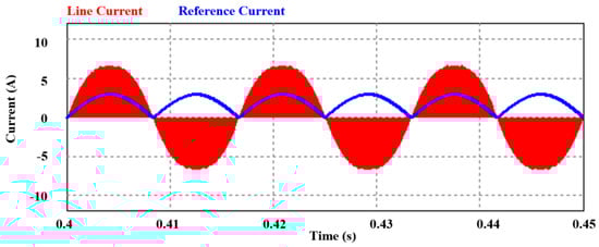 Figure 15 shows the current waveform derived using the MPC with a 20% load. Although the rectifier is in DCM, the proposed MPC algorithm is able to regulate the line current to the reference current. As mode detection was applied, a suitable duty cycle for DCM was generated. Figure 16 shows the current waveform derived using the MPC in the 100% load condition. The MPC-regulated system is able to mirror the reference current in the CCM region without problems, due to the fast dynamic response of the control algorithm. A comparison of the waveforms generated using the two systems shows that in DCM and CCM operation, there is more distortion in the current waveforms created with the PI-controlled system than those observed with the MPC-regulated system. The mode detection applied with the MPC makes it able to control the line current optimally in each conduction mode. In addition, the dynamic response of the controller is fast enough to control AC waveforms.