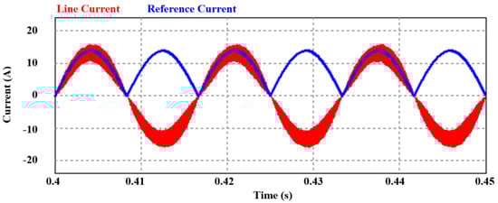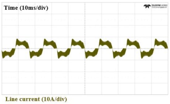 To control a Vienna rectifier in normal operation, the “important rule”, defined as the sign of the voltage being equal to the sign of the current, should be satisfied. Failure to meet this criterion contributes to the degradation of current quality and an increase in total harmonic distortion (THD) []. Conventional Vienna rectifiers apply proportional-integral (PI) controllers to the line current control loop. These devices are optimized for regulating DC, and not AC components [], as their dynamic response is not fast enough to control alternating current. Hence, an appropriate output cannot be estimated if a PI controller is used in an AC current control loop [], and THD of the line current consequently increases [,]. Therefore, as the line current frequency increases and the system power decreases, the line current distortion problem becomes dominant [].