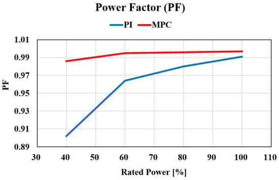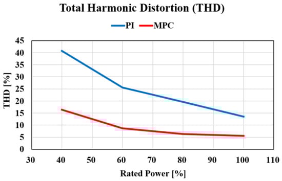 The control algorithms for DCM and CCM operation were verified using a light load condition, defined as 20% of the maximum load, and a heavy load condition, defined as 100% of the maximum load, respectively. To compare the differences between the operation of a PI controller and the MPC, simulations were conducted with a 40% load and a full load. The THD of the resulting current waveforms were used as the standard for comparison.
