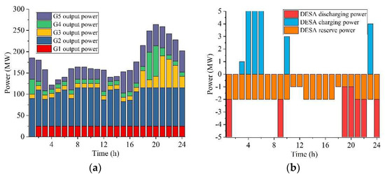Figure 7 and Figure 8 show the optimal strategy of units, DESA, and DES in cases 1 and 2 under provided upward reserve. Figure 7a and Figure 8a show the scheduled processes of the generators. The operating cost of G1 is higher than the rest of the generators. Therefore, G1 has the least contribution in the dispatch plan. When the reserve capacity requirement is less than the G1 output gap, G1 will provide reserve capacity in case 1. Due to the DESA participating in the DA reserve market in case 2, the reserve capacity provided by the generators will decrease. Figure 7b shows the optimal strategy of the DESA in case 1. The charge and discharge power of the DESA reach the upper limit. In this way, the DESA could effectively participate in the energy market and reduce the operation cost of the power system. Figure 8b shows the scheduling plan and reserve capacity plan provided by the DESA in case 2. In the case where the DESA provides reserve capacity, its charge and discharge power are under the upper limit, because the DESA needs to set aside some reserve capacity to cope with the error between the scenario wind power output and predicted wind power output. Due to low electricity prices over the time period 04:00–08:00, the DESA controls DES to charge to obtain a high arbitrage profit and tracks the trend of electricity price to maximize profit in the DA energy market. Figure 7c and Figure 8c show the scheduling plan of DES in the corresponding case.