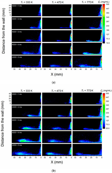 The effects of different wall temperatures at a low injection pressure are shown in Figure 4a. It can be found that the concentration obviously increases with the wall temperature rises, which is due to the effect of evaporation. Also, the speed of the spray spreading is raised because of the increase of wall temperatures. However, in Figure 4b,c, the evaporation rate of the spray is accelerated by the increase of injection pressure. The effect of the wall temperature on the evaporation rate declines with the increase of injection pressure.