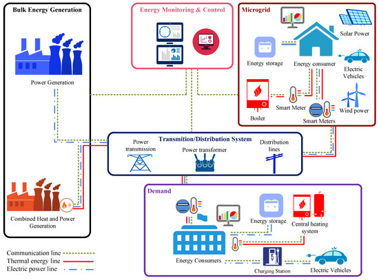 Energy system scheme including electrical, thermal, and communication infrastructures.