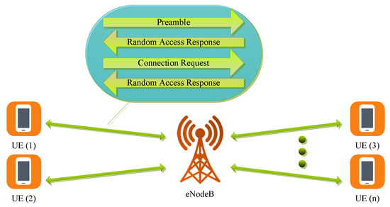Machine-Type Communication (MTC) is defined as the data exchange and processing among machines with the minimum intervention of human, which is generally used in IoT-based systems. To establish data connection among things in MTC, several steps must be followed: first of all, things that are supposed to be connected should establish a session between them (Figure 2). In this step, the flow and direction of data flow need to be controlled. Depending on the nature of the application, full duplex, half duplex, or simplex communication mode will be established. In this manner, applications must know when and how long they should send information. For this step, International Organization for Standardization (ISO) introduces a detailed protocol in order to establish the connection between objects in communication systems [53]. In the second step, they may exchange their main information. Based on the importance of the establishment of the access or the importance of the main data (payloads), several MTC technologies are used. For example, in the Long-Term Evolution (LTE) standard, to establish the connection of User Equipment (UE) with a higher level Evolved Node B (eNodeB), it is possible that a collision happens during the process [54]. The collision may happen if two or more UEs try to send preambles simultaneously. Then, as eNodeB is not able to recognize a collision happens, it will send a Random Access Response (RAR) to the recognized UEs. To increase the chance of successful connection, several attempts will be done by UEs accordingly. This access reservation procedure has a probabilistic characteristic, and the packet may be lost during the data transmission both in the uplink and downlink processes, or even failure and limitations in the system bottlenecks [54,55]. Different perspectives of MTC challenges are defined and tried to overcome in the third Generation Partnership Project (3GPP) by different solutions and technologies like LTE and Low Power Wide Area Network (LPWAN) introduced as NarrowBand IoT (NB-IoT) [56,57].