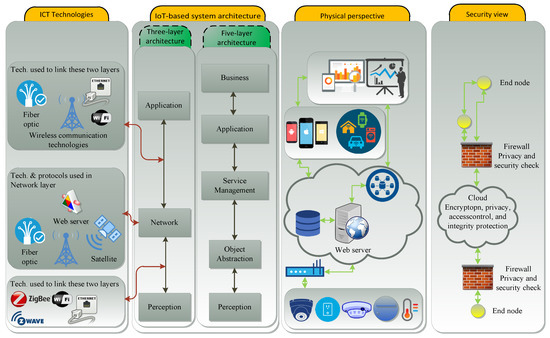 Architecture design is another challenge in IoT-enabled energy systems. System architectures are designed based on its applications and use. A basic architecture for an IoT system includes three layers: application layer, network layer, and perception layer [116]. The application layer is the top layer in which transferred data from network layer are proceed and used to provide services. Network layer is the middle layer, which is responsible to receive information from perception layer and transmit it application layer. Most IoT components such as communication systems’ components and protocols are categorized in this layer. The lowest layer in three-layer IoT architecture is the perception layer. Collecting information from sensors and processing of data are considered in this layer. The three-layer architecture is introduced by standards, like IEEE P2413 [114]. This architecture is also recommended for health care systems and smart grids [117,118].