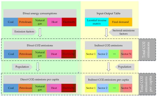 In this study, we considered both direct and indirect emissions caused by rural and urban household consumption (as shown in Figure 1). Total emissions are obtained by summing direct CO2 emissions and indirect CO2 emissions []. The direct CO2 emissions mainly refer to the consumption of coal, oil, gas, electricity, and heat from China energy statistical yearbook, while the indirect CO2 emissions are caused by the consumption of products and services, which is also named embodied emissions [,].