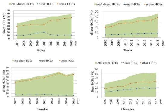 Urban direct HCEs were much larger than rural direct HCEs for the four megacities; for instance, Shanghai’s urban direct HCEs were more than 18 times larger than rural direct HCEs in 2015, which accounted for about 95% of its total direct HCEs. Beijing’s rural and urban HCEs show different trends. These can be divided into two phases. The first phase is from 2007 to 2011. During this phase, both rural and urban direct HCEs kept a similar increasing trend. However, they have showed different trends since 2012. Urban direct HCEs increased sharply in 2012. After that, they kept increasing steadily. On the contrary, rural direct HCEs declined significantly in 2012, then remained about the same. Tianjin’s urban direct HCEs increased rapidly during 2007–2015 with an annual increase rate of 9%, while the annual increase rate of rural direct HCEs were 7%, whereas Chongqing’s urban and rural direct HCEs kept the same annual increase rate, which was 8%.