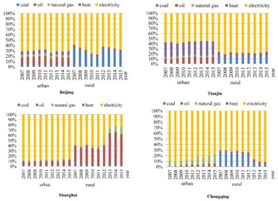 Energy consumption structure for direct HCEs are shown in Figure 3. The energy consumption structure of Beijing’s urban households remained stable from 2007 to 2015. By contrast, rural households’ energy consumption structure had a large fluctuation during 2008–2011. Due to the global financial crisis, coal prices rose sharply []. The coal consumption of rural households dropped significantly. In 2011, the share of coal was only 20.6%. After the financial crisis, coal consumption rose and stayed stable with a relatively lower coal price. Heat consumption in Tianjin’s urban households accounted for 26–29% of their total direct energy consumption, which was much higher than Beijing. It is unexpected to find that the oil consumption of Shanghai’s rural households accounted for about one third of their total direct energy consumption. After the financial crisis, the share increased to more than 60%. By contrast, the household energy consumption structure in Chongqing was cleaner.