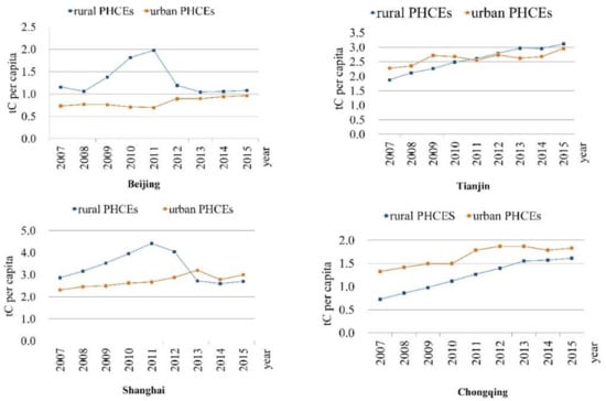 From the perspective of total PHCEs, Chongqing’s rural and urban PHCEs increased by 73.59% and 21.01%, respectively. Beijing’s rural and urban PHCEs decreased by 10.69% and 1.19%. Rural PHCEs in both Tianjin and Shanghai respectively increased by 8.03% and 38.72%, while urban PHCEs decreased by 27.10% and 10.89%, respectively.