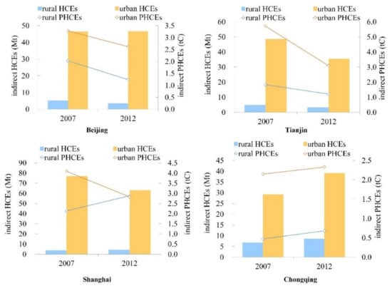 From the perspective of per capita, urban and rural indirect PHCEs of Beijing and Tianjin decreased from 2007 to 2012, while urban and rural indirect PHCEs of Chongqing increased. Urban indirect PHCEs of Shanghai were two times that of rural indirect PHCEs in 2007. However, they were about the same in 2012.