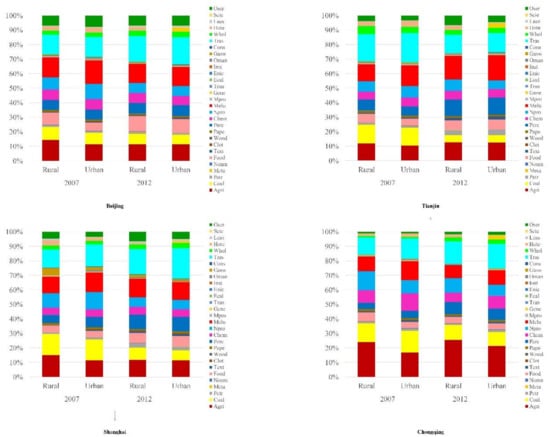 For both urban and rural households in Beijing, Tianjin, and Chongqing in China, CO2 emissions caused by electricity consumption accounted for the largest proportion of their direct CO2 emissions: the most carbon-intensive categories were electricity and hot water production and supply. For instance, the shares of direct HCEs from electricity in Beijing were 71.3% and 58.2% in 2007 for urban and rural household, respectively, and increased to 73.7% and 62.3% in 2012, respectively. An increased level of income or consumption increased the probability of the use of electricity [,]. Thus, the result reflects the improvement of the income and living standard of urban and rural household and the widespread use of household electrical appliances with the rapid development of economy.