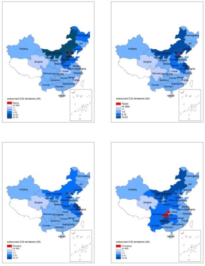 - Feng, K.S.; Davis, S.J.; Sun, L.X.; Li, X.; Guan, D.B.; Liu, W.D.; Liu, Z.; Hubacek, K. Outsourcing CO2 within China. Proc. Natl. Acad. Sci. USA 2013, 110, 11654–11659. [Google Scholar] [CrossRef] [PubMed]
