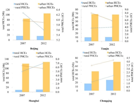 Urban direct HCEs were much larger than rural direct HCEs. There are several reasons for this: (1) in terms of both quantity and variety, urban residents have more household equipment than rural residents; (2) urban citizens have more cars, which not only brings about severe traffic problems, but also consumes lots of gasoline and produces more emissions; and (3) the population of urban areas is larger than that of rural areas. With rapid urbanization, more and more people flood into the city. For example, Beijing’s urban population was six times larger than the rural population in 2014.