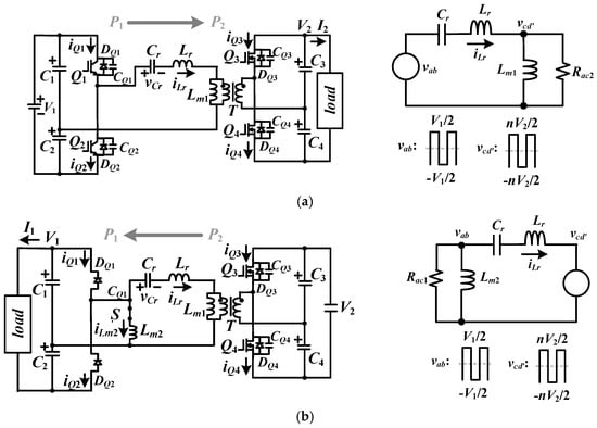 The circuit schematic of the studied dual half-bridge converter is provided in Figure 1 to realize bidirectional power flow. Two half-bridge circuits are used on both the high- and low-voltage sides and one resonant tank is adopted on the high-voltage side to achieve the soft switching characteristic under frequency control. If power is transferred from high-voltage V1 to low-voltage V2 as shown in Figure 2a, the ac switch S is open and the dual half-bridge converter is worked under buck mode operation. Q1 and Q2 are main power devices and Q3 and Q4 are operated as synchronous rectifiers. Lr, Cr, and Lm1 are operated as an LLC resonant converter to have low switching losses and high circuit efficiency functions. If power is transferred from low-voltage V2 to high-voltage V1 as shown in Figure 2b, the ac switch S is closed and the dual half-bridge converter is worked under boost mode operation. Under this condition, Q3 and Q4 are the main power devices, Q1 and Q2 are off, and the antiparallel diodes are worked as the full-wave rectifier. Lr, Cr, and Lm2 are operated as an LLC resonant converter to give low switching losses and high circuit efficiency functions.