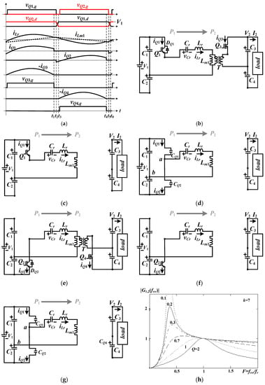 The studied dual half-bridge converter can achieve bidirectional power flow capability. When power is transferred from high-voltage V1 to low-voltage V2, battery banks or super capacitors can be adopted as energy storage units on the low-voltage terminal. The circuit configuration of the adopted dual half-bridge converter under forward power flow is shown in Figure 2a. The ac switch S is off under forward power flow. Q1 and Q2 are worked as the main switches to generate a square wave voltage on voltage vab. Q3 and Q4 are operated as synchronous rectifiers to lessen conducting losses on the low-voltage side. According to the polarity of the secondary side current, a square wave voltage is generated on voltage vcd’. Lm1 is the magnetizing inductance of the transformer; Lr and Cr are the resonant inductor and capacitor. Q1 and Q2 are controlled by using frequency modulation to regulate load current I2 or voltage V2. Due to the resonant operation by Lr, Cr, and Lm1, the soft switching operation of Q1 and Q2 can be realized. Figure 3a demonstrates the basic PWM signals of the studied converter under forward power flow operation. If the series resonant frequency is higher (or lower) than the operating frequency, there are six (or four) operation stages per switching cycle as shown in Figure 3b–g. The circuit operations of the studied circuit under forward power flow are presented in the following.