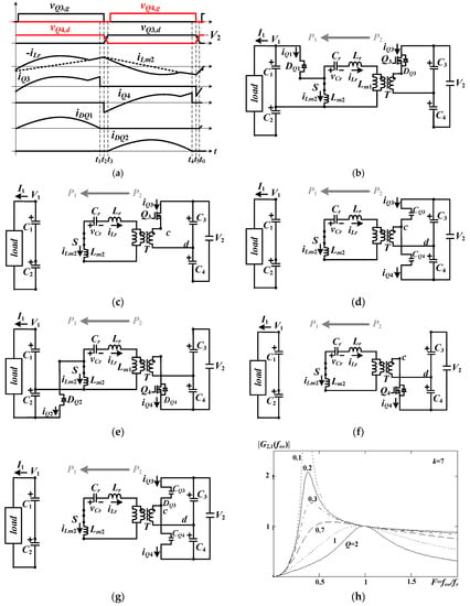 where , , k = Lm2/Lr, and F = fsw/fr. Based on V1, V2, k, and Rac1, the necessary switching frequency can be obtained from Equation (12). The gain curve of the proposed converter under reverse power flow is plotted in Figure 4h under inductor ratio k = Lm2/Lr = 7.