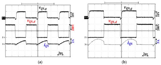 Test results of switch Q1 under V1 = 400 V with (a) 96 W (20%) output and (b) 480 W (100%) output.