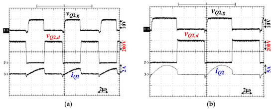 Test results of switch Q2 under V1 = 400 V with (a) 96 W (20%) output and (b) 480 W (100%) output.