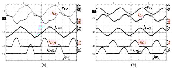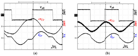 Test results of vab, −vCr, and iLr under 480 W output with (a) V1 = 350 V and (b) V1 = 400 V.