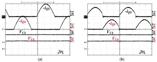 Test results of −iQ3, −iQ4, VC3, and VC4 under 480 W output with (a) V1 = 350 V and (b) V1 = 400 V.