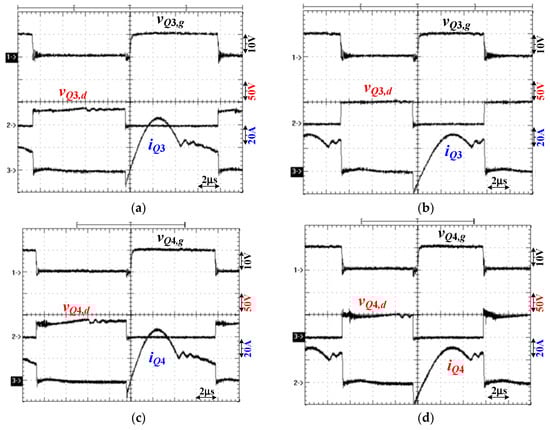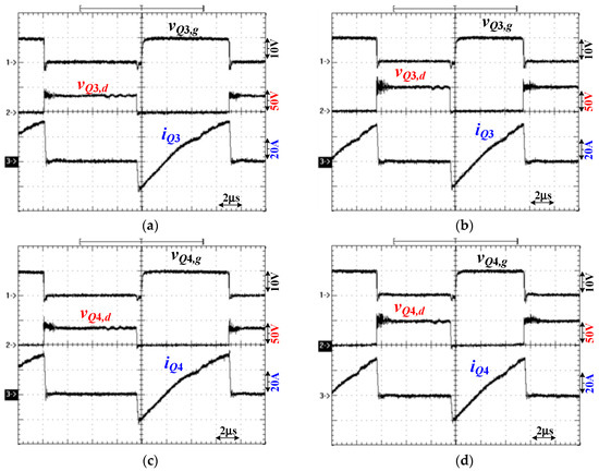 Test results of Q3 and Q4 under reverse power flow and 480 W (100% load) output with (a) Q3 at V2 = 38 V, (b) Q3 at V2 = 52 V, (c) Q4 at V2 = 38 V, and (d) Q4 at V2 = 52 V.