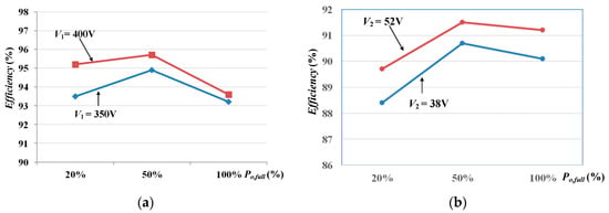Based on the circuit parameters derived from the previous section, a 480 W prototype circuit was tested to validate the practicability of the studied converter. Figure 5, Figure 6, Figure 7 and Figure 8 demonstrate the test results under forward power flow operation. Figure 5 shows the test results of Q1 at 20% load and full load. The test results show that Q1 turns on at zero voltage for both 20% and 100% loads. Likewise, Figure 6 demonstrates test results of Q2 under different load conditions. It is observed that the soft switching turn-on characteristics of Q2 are also achieved. Figure 7 demonstrates the measured waveforms of the resonant voltage and resonant current. The test results show that the switching frequency is close to the series resonant frequency under 400 V input. Thus, the resonant current is close to a sinusoidal waveform. On the other hand, the series resonant frequency is greater than the switching frequency under the 350 V input case. Figure 8 demonstrates the test results of the secondary side currents and capacitor voltages. The output capacitor voltages VC3 and VC4 are balanced and the switch currents −iQ3 and −iQ4 are also balanced. Figure 9, Figure 10 and Figure 11 demonstrates test results of the studied converter under reverse power flow. The soft switching characteristics of Q3 and Q4 are given in Figure 9 and Figure 10 and the resonant voltage and current are demonstrated in Figure 11. Figure 12 shows the measured circuit efficiencies of the studied circuit. The efficiencies of the proposed converter under forward power flow and V1 = 400 V are 95.2%, 95.7%, and 93.6% under 20%, 50%, and 100% loads, respectively. The efficiencies of the proposed converter under reverse power flow and V2 = 52 V are 89.7%, 91.5%, and 91.2% under 20%, 50%, and 100% loads, respectively. The proposed converter has better circuit efficiency under forward power flow due to the fact that MOSFETs are used on the low-voltage side to reduce the conduction losses. The measured switching frequencies of the proposed converter under forward power flow are 138 kHz (or 84 kHz), 114 kHz (or 79 kHz), and 99 kHz (or 71 kHz) under 400 V (or 350 V) input and 20% load, 50% load, and 100% load output, respectively. Lower input voltage results in low switching frequency and the switching frequency is increased when the dc load is decreased. Figure 13 gives a picture of the experimental setup and a photo of the proposed converter in the laboratory test.