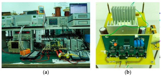 Pictures of the studied converter in the laboratory: (a) experimental setup, (b) prototype circuit.